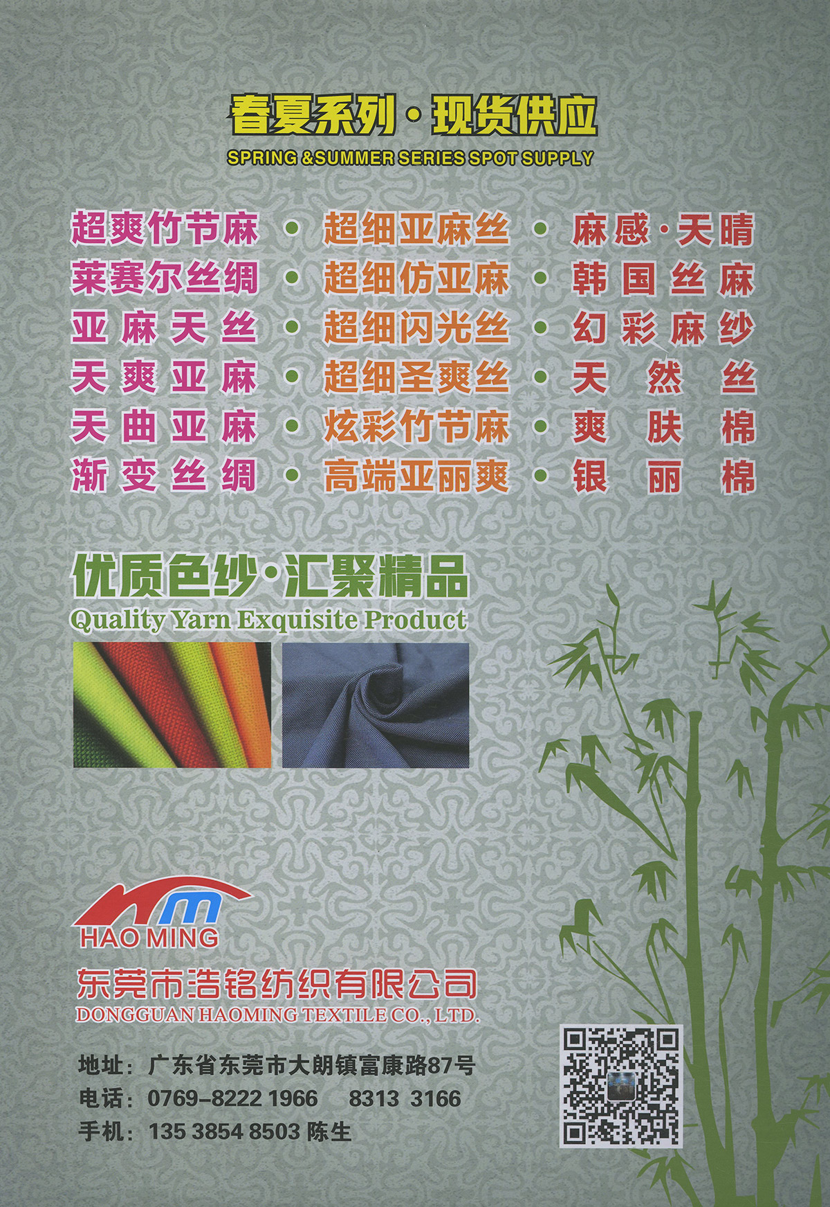 春夏產品系列:超爽竹節麻、天爽亞麻、麻感.天晴、天然絲、天曲亞麻、超細亞麻絲、萊賽爾絲綢、超細圣爽絲(親膚麻絲)、超細閃光絲(銀爽絲)、超細仿亞麻、炫彩竹節麻、亞麻天絲、漸變絲綢、幻彩麻紗、爽膚棉、銀麗棉、韓國絲麻、高端亞麗爽