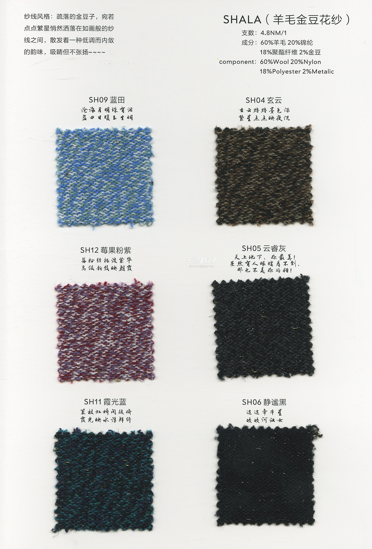 春夏:棉/麻/醋酸/蠶絲/和紙/伊力特/天絲類 秋冬:全毛圈圈紗/羊毛羊絨類
