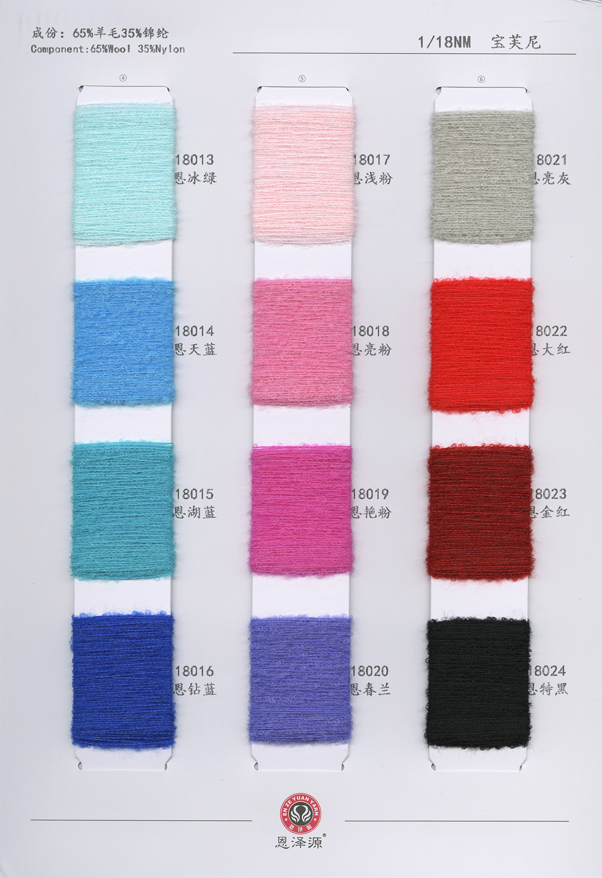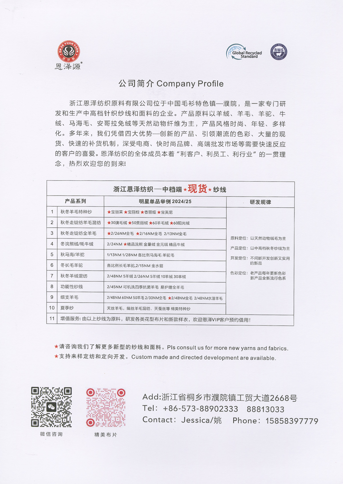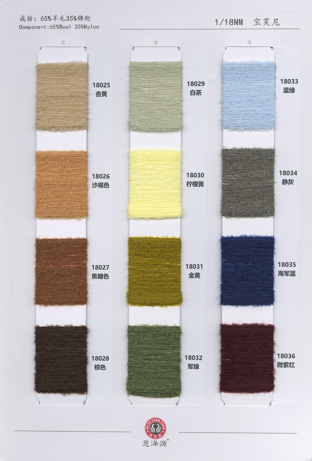 1、26支100%全羊毛,2/16支100%全羊毛 16支點子紗 2、2/26支 粗紡50羊毛 30羊毛 3、2/24支 2/16支 精品浣熊絨 4、26支 10羊絨,30羊絨 5、各種比例馬海毛,羊駝毛 6、3/70支 10%羊毛90%天絲,絹絲羊毛