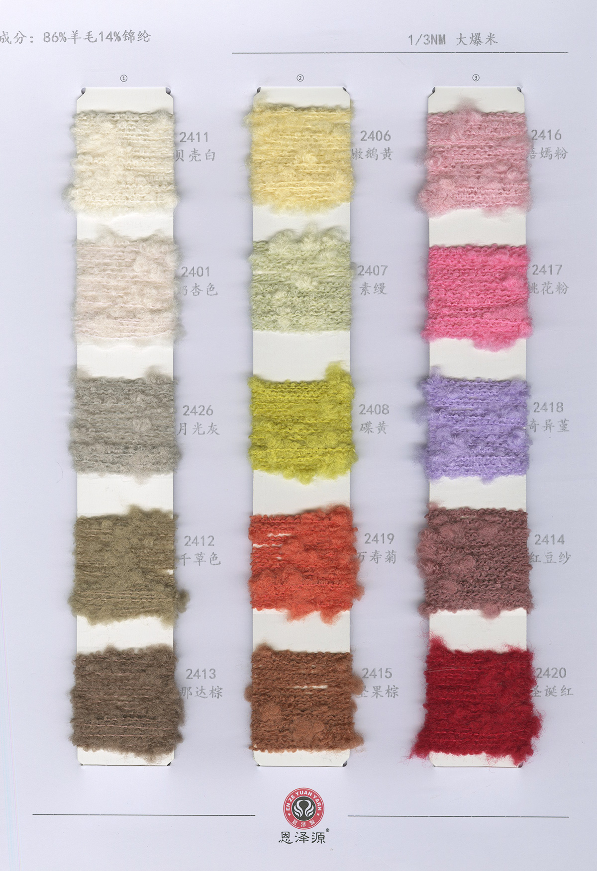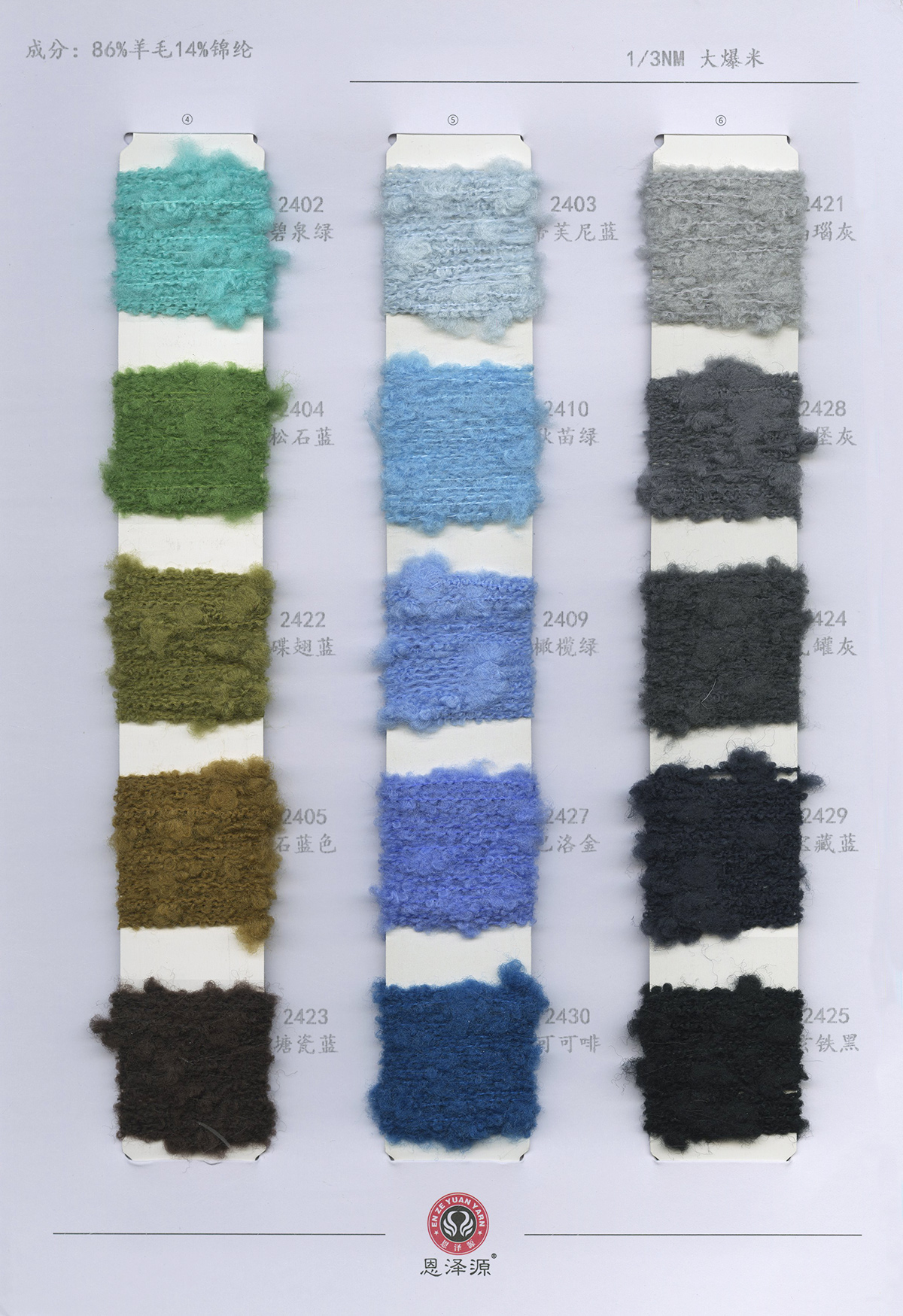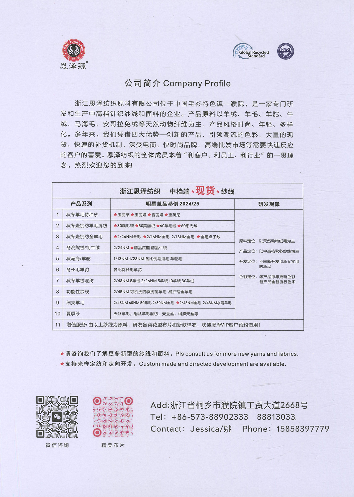 1、26支100%全羊毛,2/16支100%全羊毛 16支點(diǎn)子紗 2、2/26支 粗紡50羊毛 30羊毛 3、2/24支 2/16支 精品浣熊絨 4、26支 10羊絨,30羊絨 5、各種比例馬海毛,羊駝毛 6、3/70支 10%羊毛90%天絲,絹絲羊毛