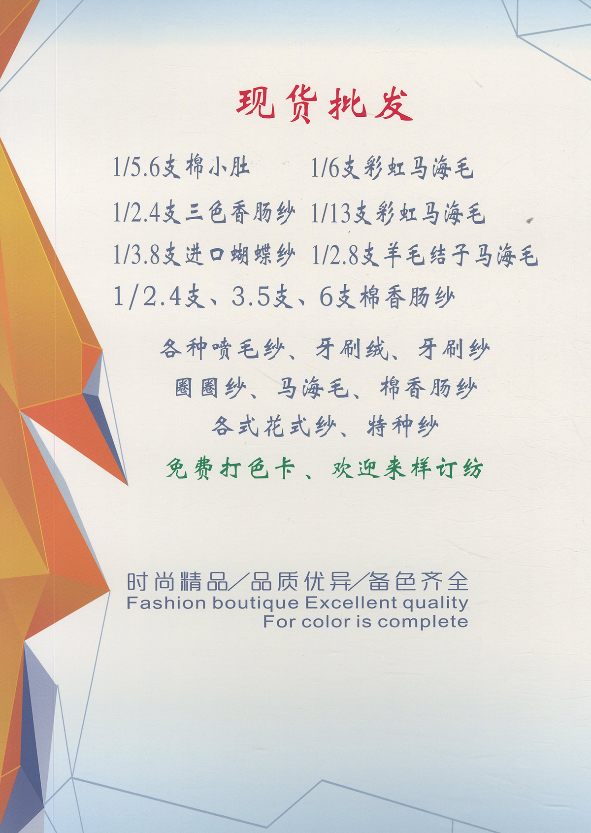 主營(yíng)產(chǎn)品現(xiàn)貨 彩虹系列、蝴蝶紗系列、純棉大肚紗系列、棉香腸紗系列、滌綸香腸紗系列、 牙刷絨,有光牙刷紗,樓梯紗,燈籠紗,結(jié)子紗,菊花紗,半邊絨、圈圈紗大量現(xiàn)貨白胚 歡迎來(lái)樣加工定制各種花式紗 以上產(chǎn)品均有中性色卡,歡迎同行力推本公司產(chǎn)品。