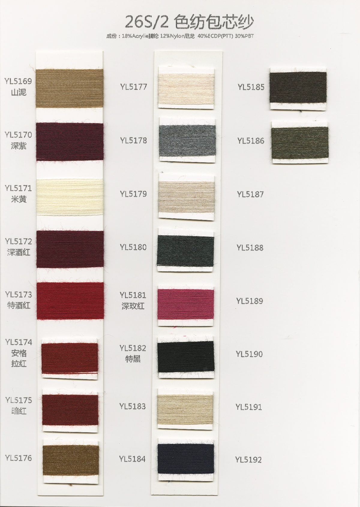 15NM/1長毛馬海毛、24S/1有色仿亞麻、5.8支不掉毛半邊絨、48/2 9羊毛混紡、26S/2 28S/2有色人造毛(仿羊絨)、有色兔絨包芯紗、有色高彈包芯紗、1.3CM仿貂毛、有色錦綸、高彈絲拉架、140D/70D有色仿錦綸、24S/2有色雙曲、16S/1冰爽絲、28NM/2抗起球莫代爾包芯紗、48NM/2抗起球羔羊絨混紡、45NM/2 6羊毛混紡紗、2CM仿貂毛