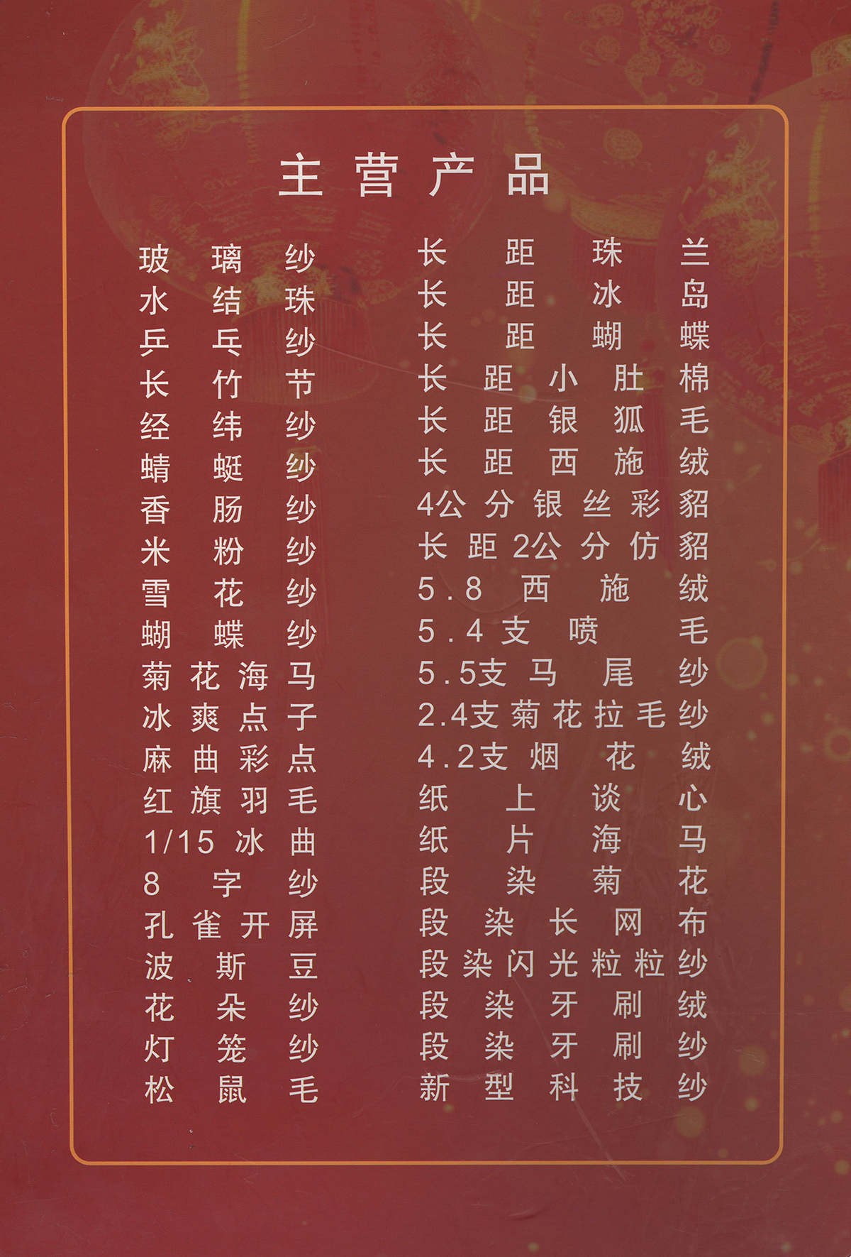 玻璃紗、水結珠、蝴蝶紗、閃光球毛、櫻花絨、牙刷紗、乒乓紗、冰島毛、段染紙片紗,段染二經一緯