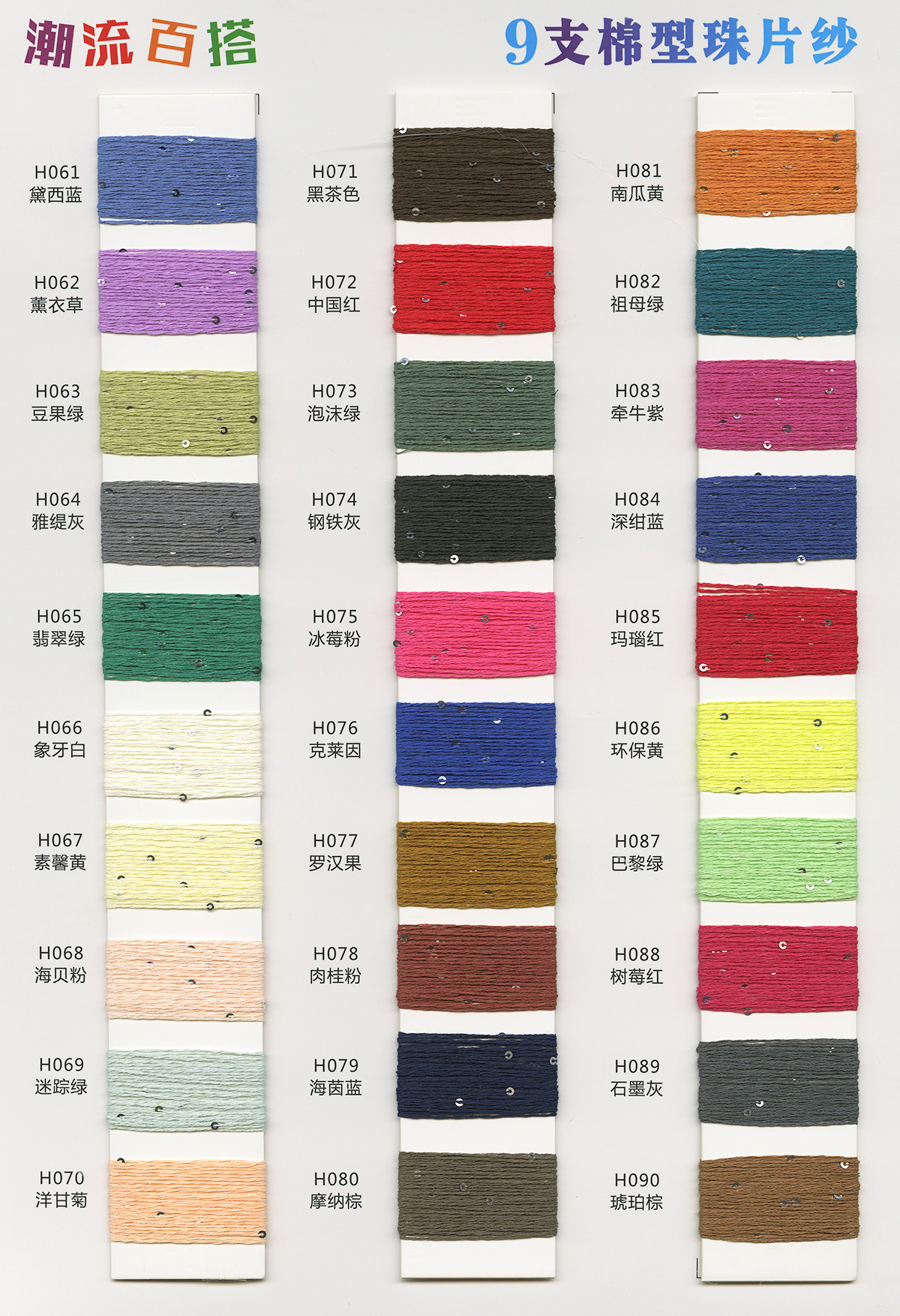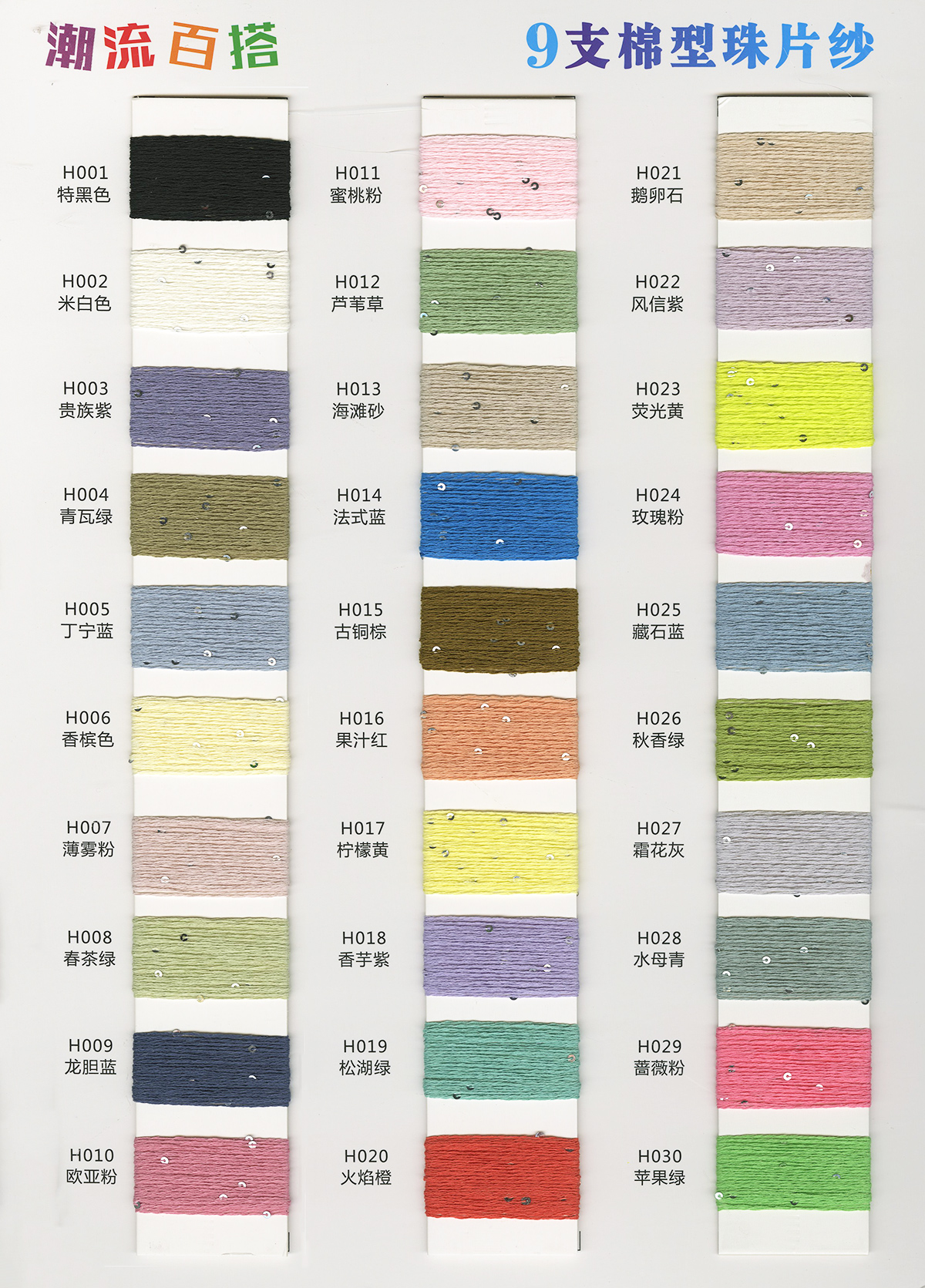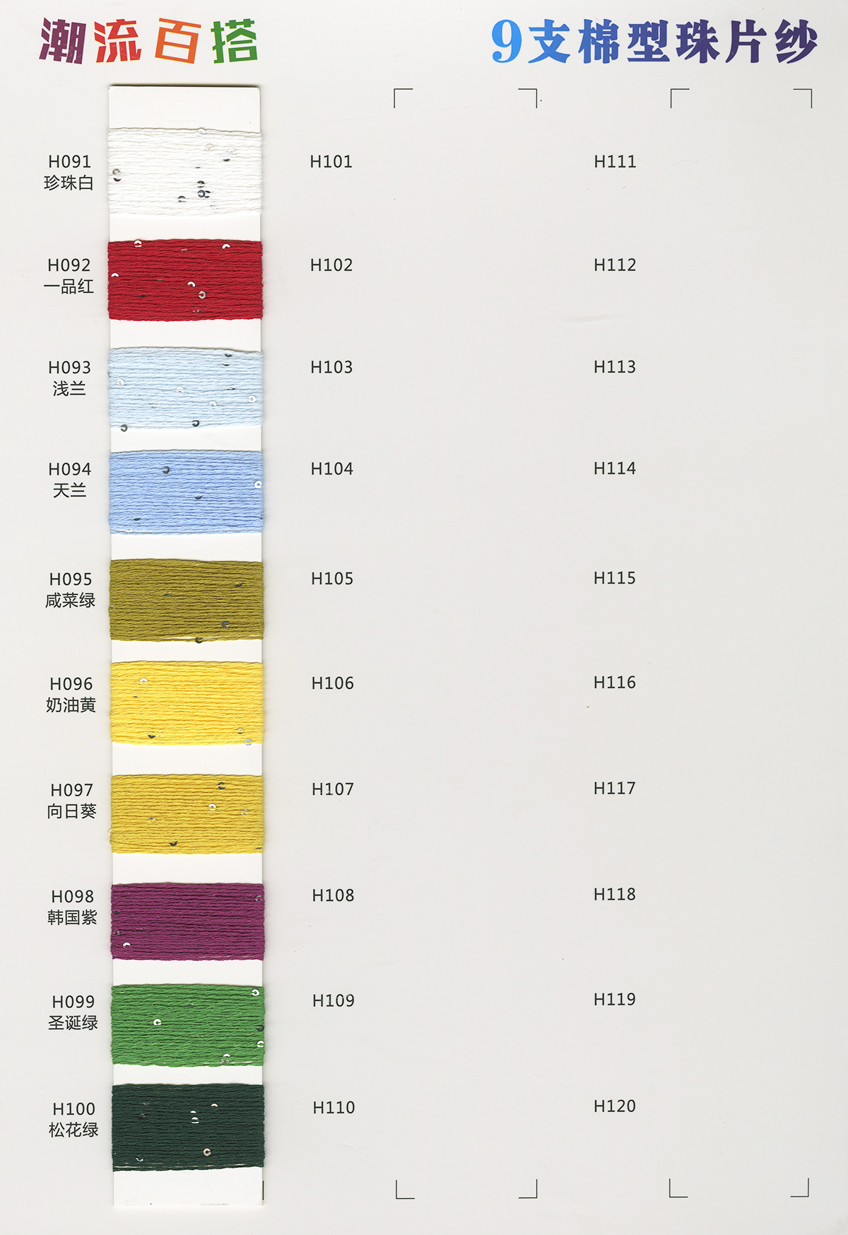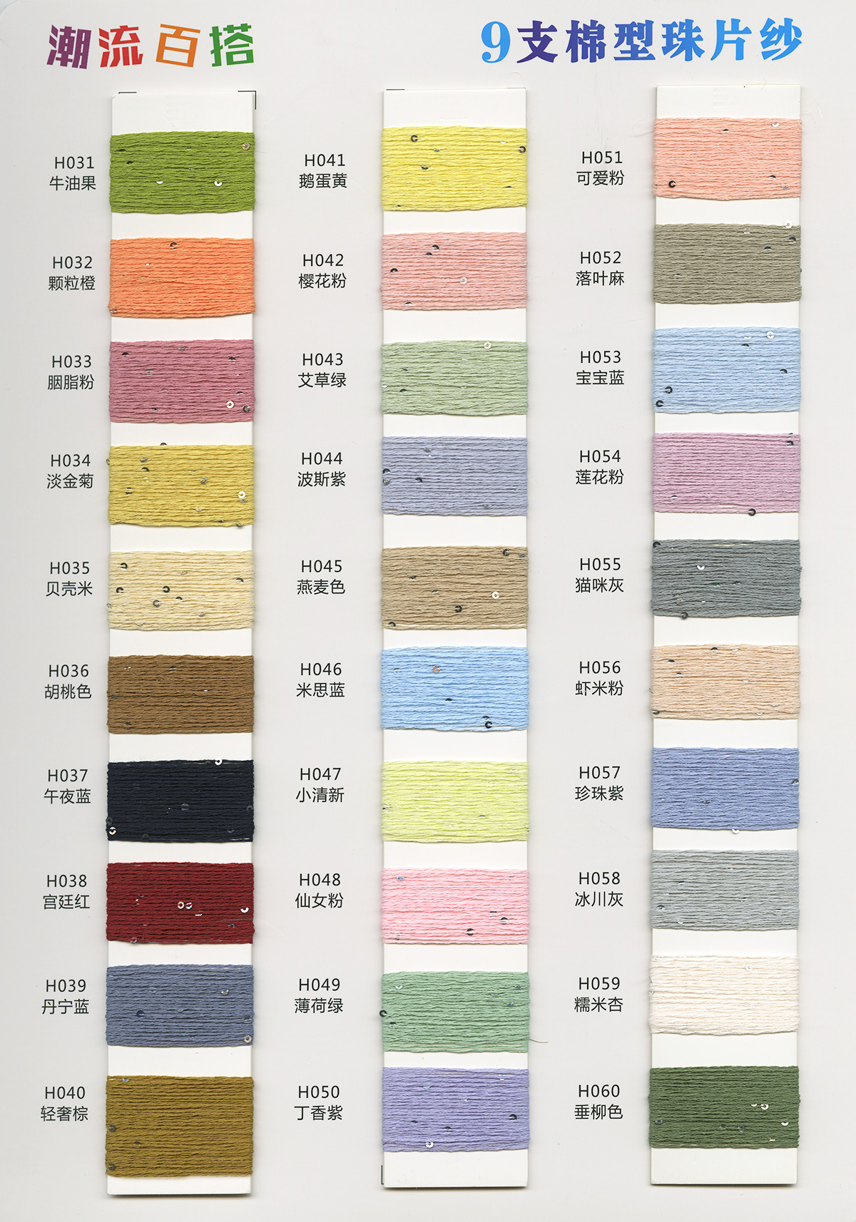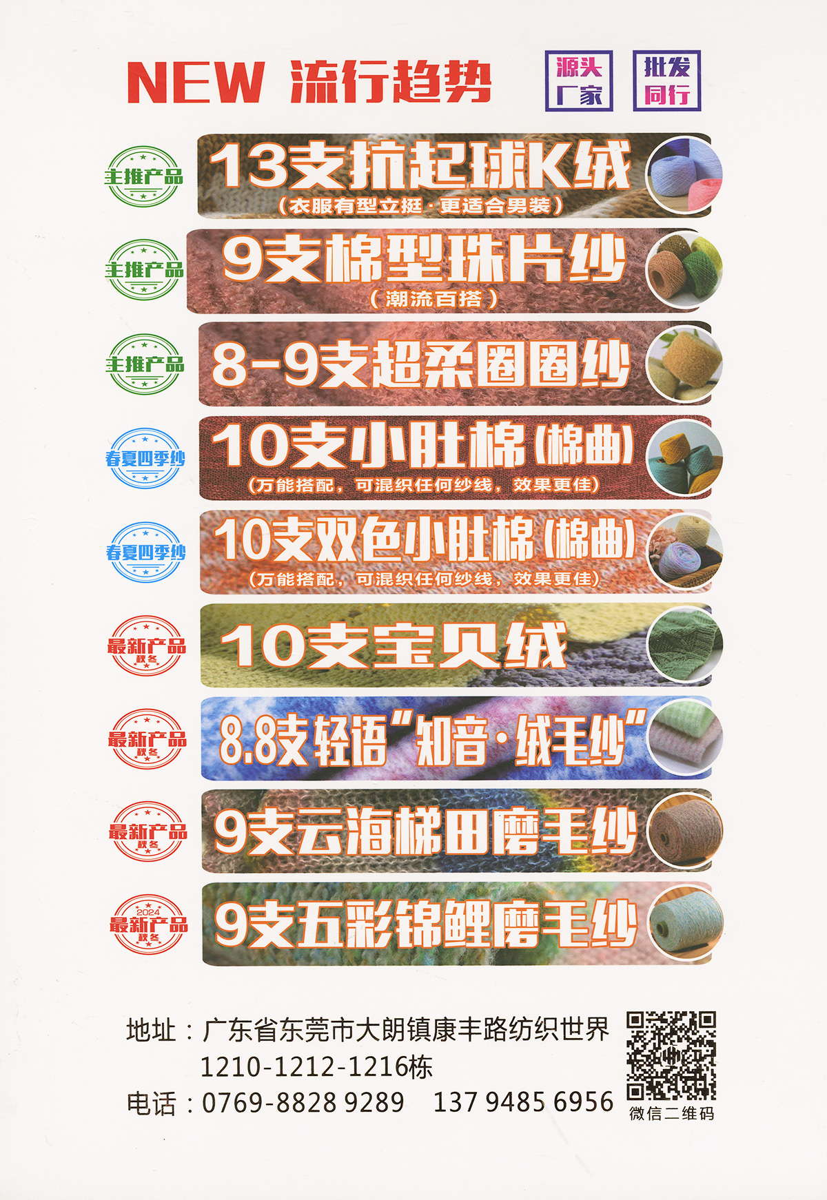 12支抗起球仿棉晴紗、13支升級版抗起球K絨、8-9支超桑圈圈紗、9支云海梯田磨毛紗、9支五彩錦鯉磨毛紗、10支小肚棉(棉曲)、10支雙色小肚棉、10支寶貝絨(海葵絨)(木棉花絨)、10支棉型珠片紗