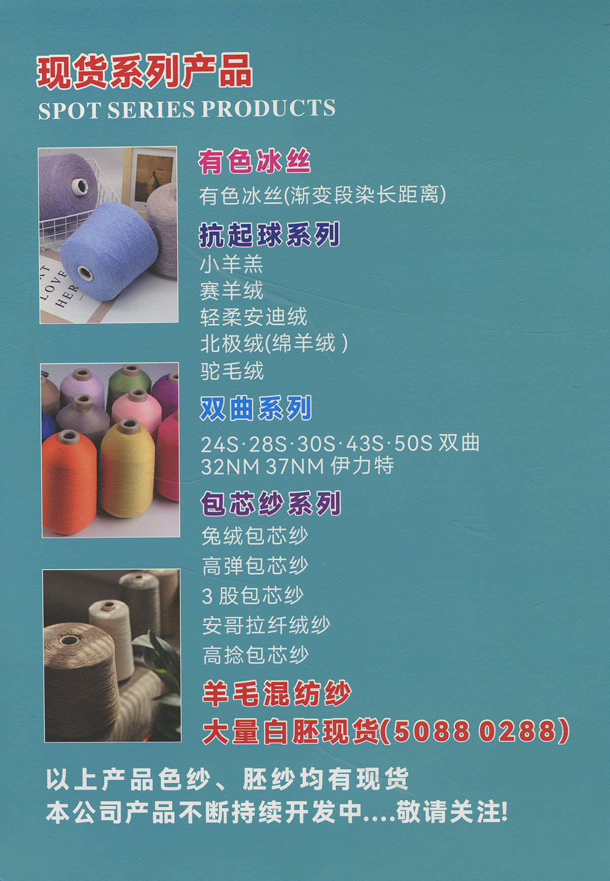 28S/1冰絲;24S/2、30S/2雙曲;28S/2高彈包芯紗;28S/2莫代爾包芯紗;抗氣球高捻天竹;抗起球高捻包芯紗;18S/2抗起球·北極絨等優(yōu)質(zhì)紗線