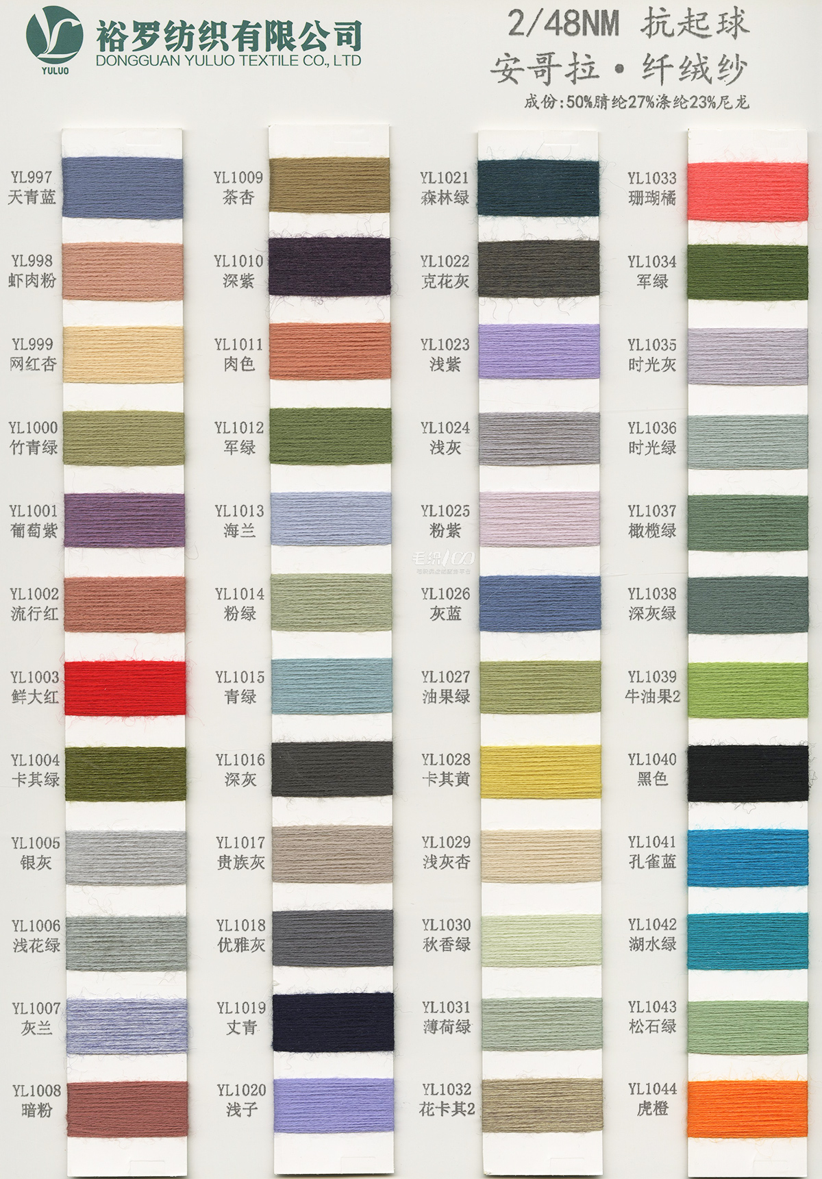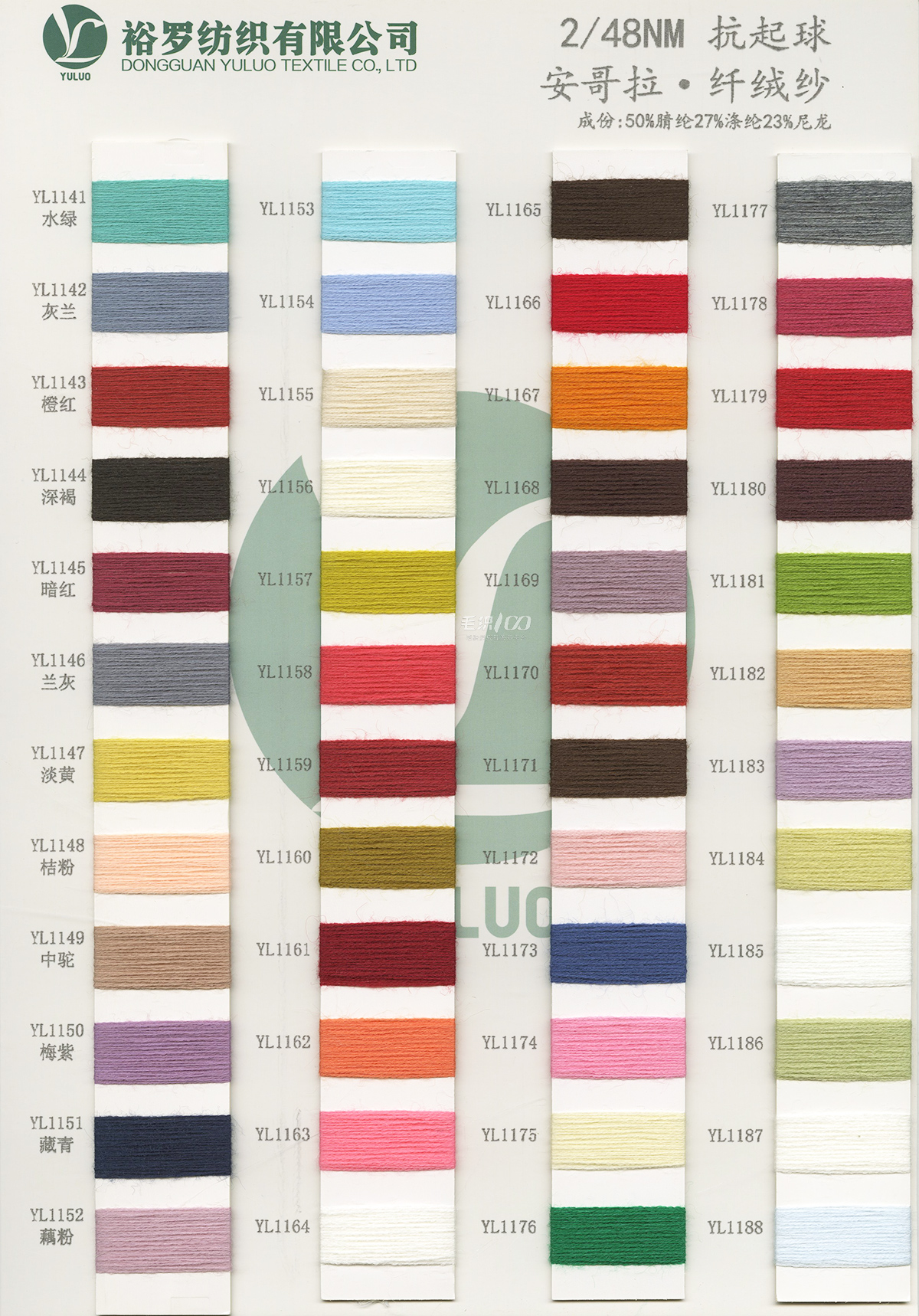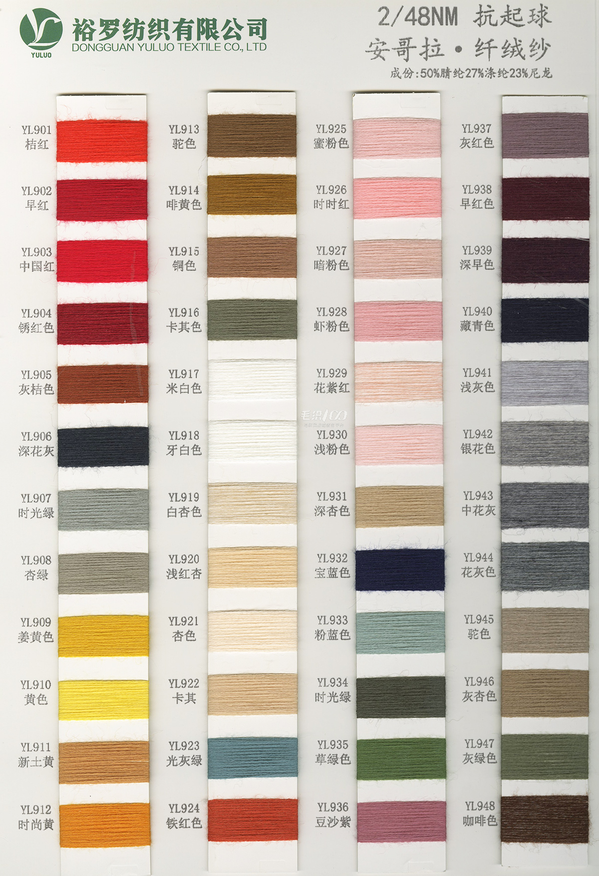 15NM/1長毛馬海毛、24S/1有色仿亞麻、5.8支不掉毛半邊絨、48/2 9羊毛混紡、26S/2 28S/2有色人造毛(仿羊絨)、有色兔絨包芯紗、有色高彈包芯紗、1.3CM仿貂毛、有色錦綸、高彈絲拉架、140D/70D有色仿錦綸、24S/2有色雙曲、16S/1冰爽絲、28NM/2抗起球莫代爾包芯紗、48NM/2抗起球羔羊絨混紡、45NM/2 6羊毛混紡紗、2CM仿貂毛