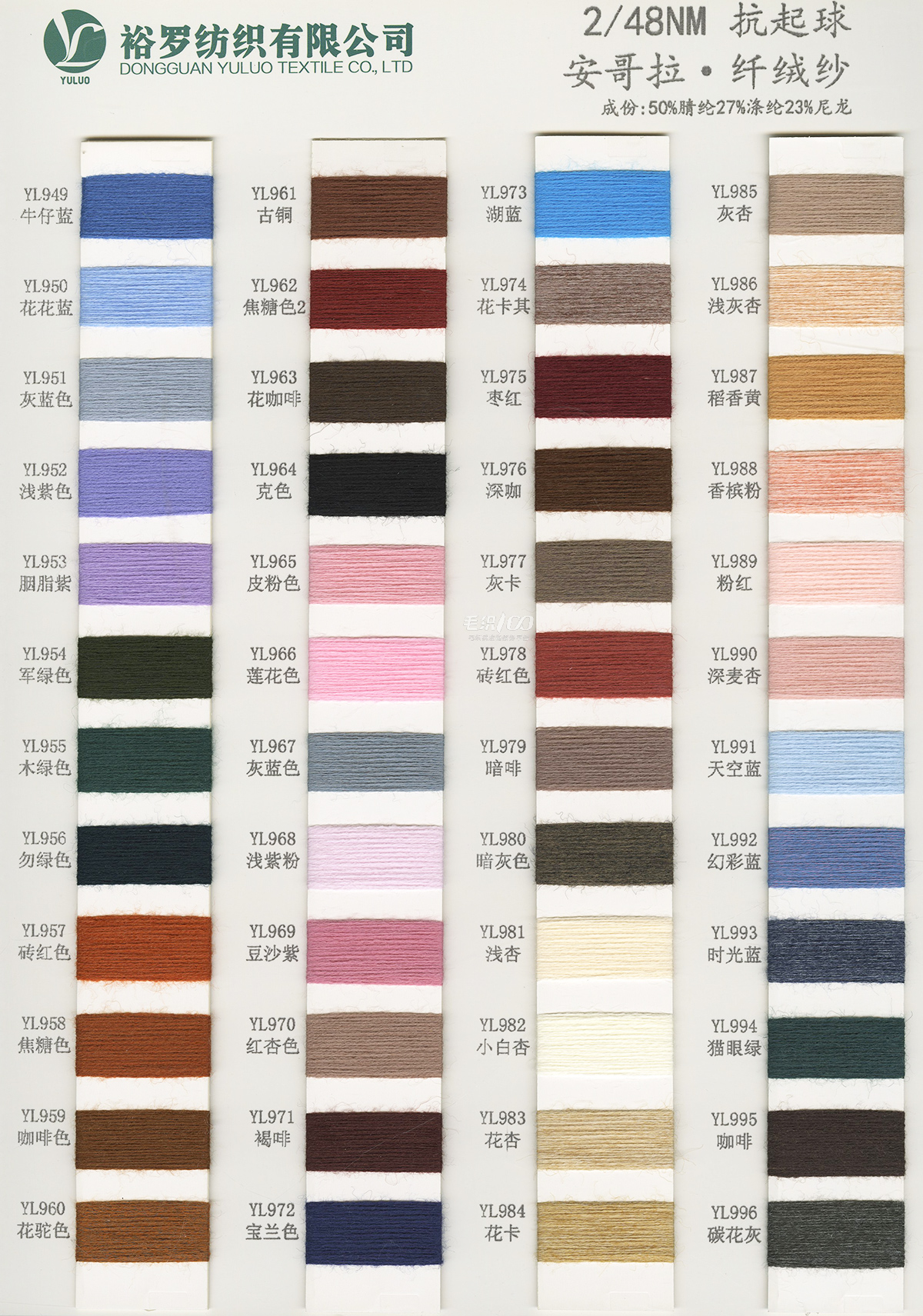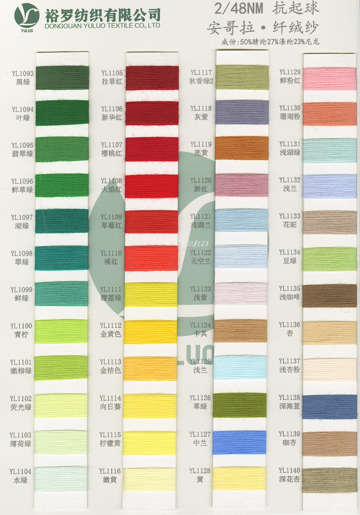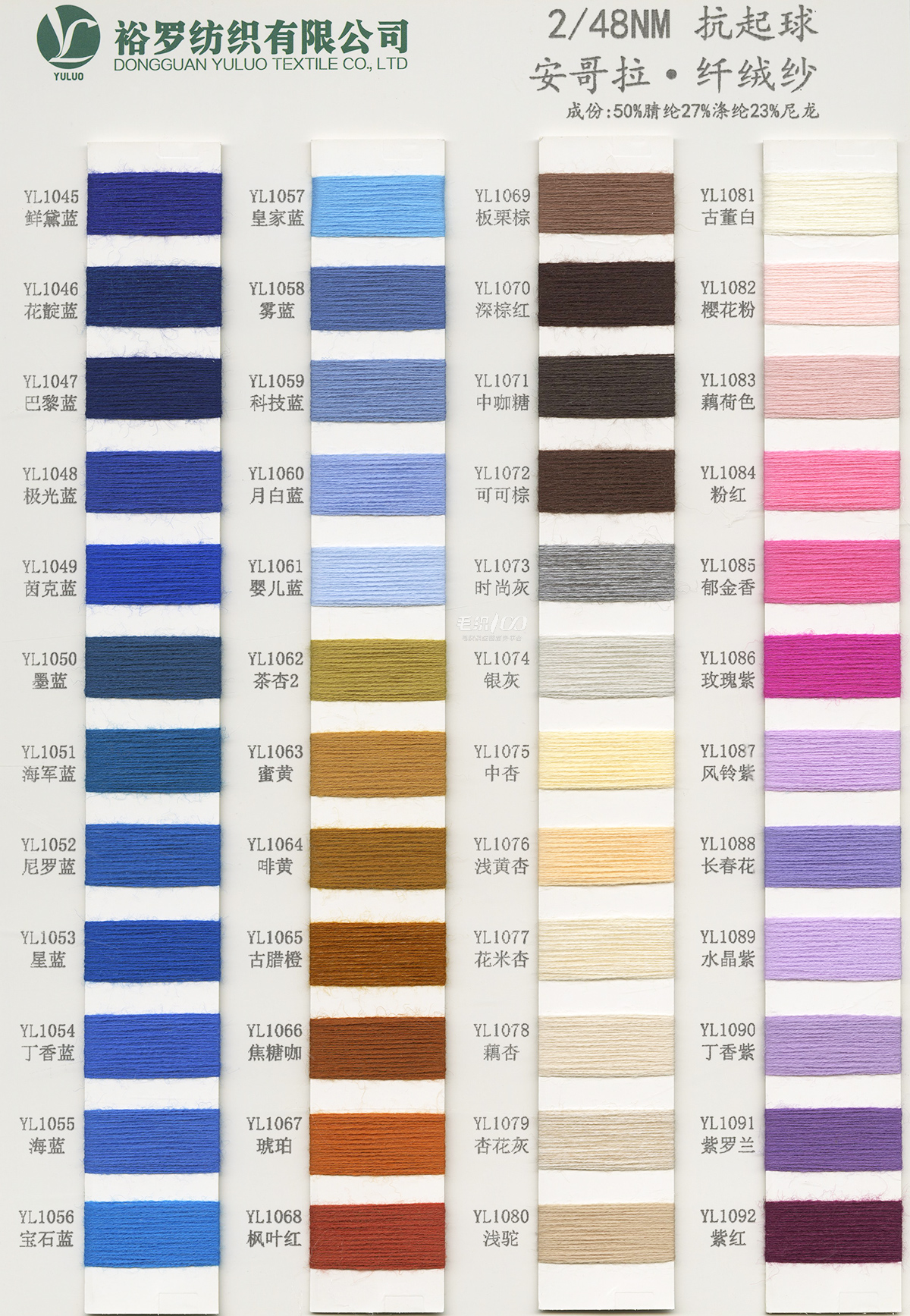 15NM/1長毛馬海毛、24S/1有色仿亞麻、5.8支不掉毛半邊絨、48/2 9羊毛混紡、26S/2 28S/2有色人造毛(仿羊絨)、有色兔絨包芯紗、有色高彈包芯紗、1.3CM仿貂毛、有色錦綸、高彈絲拉架、140D/70D有色仿錦綸、24S/2有色雙曲、16S/1冰爽絲、28NM/2抗起球莫代爾包芯紗、48NM/2抗起球羔羊絨混紡、45NM/2 6羊毛混紡紗、2CM仿貂毛
