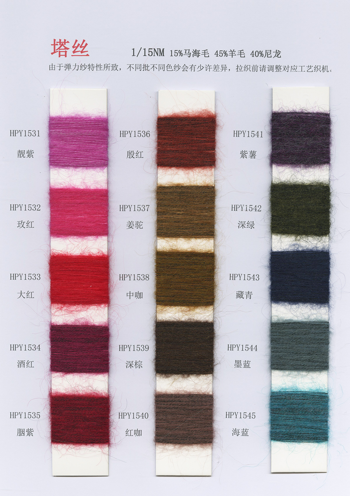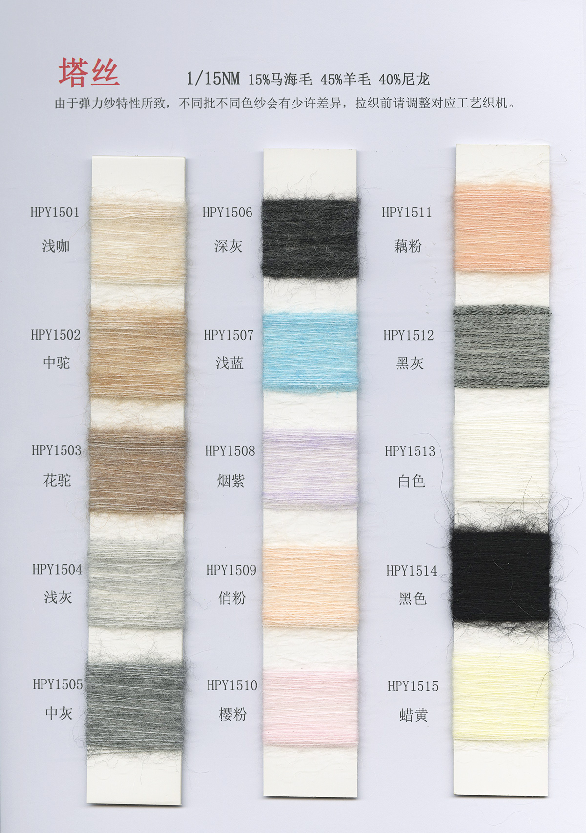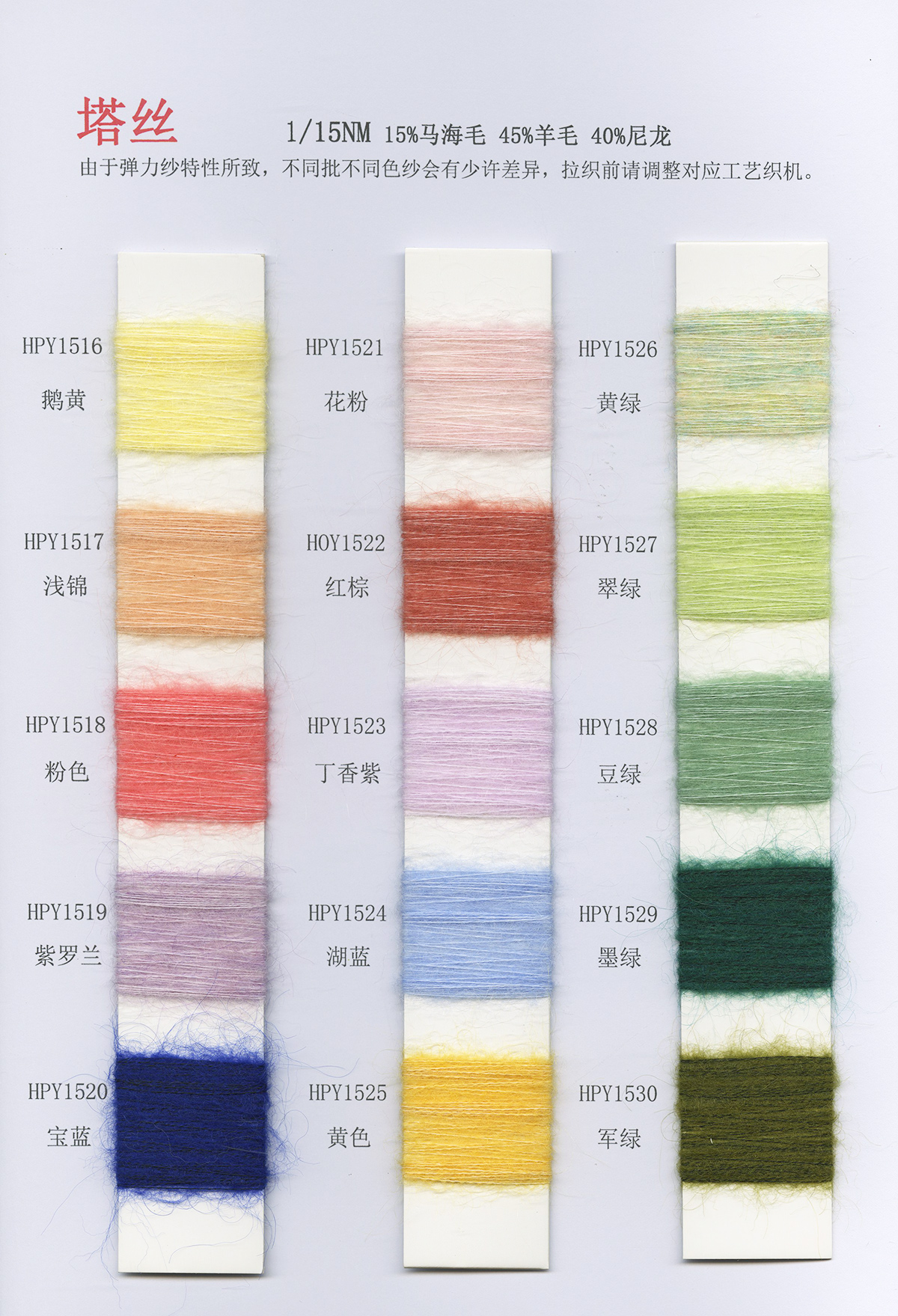 6/1維絲可噴毛絨、14/1雅克牛絨、5.5/1雪花駱馬絨、3.5/1絢麗噴毛絨、8/1羊駝噴毛絨、5.5/1駱馬噴毛絨、3.5/1亮彩噴毛絨、15/1迷你羊駝圈圈、14/1纖柔馬海圈圈、7.5支馬海圈圈紗、13/1羊毛長毛、9.8支駱馬長毛、5.5支羊駝長毛、14/1華咔約馬海、12/1北美浣熊絨、9/1阿拉善駱駝絨、14/2芙爾麗絨、6/2新絲麗絨、2/16南非再生駝絨