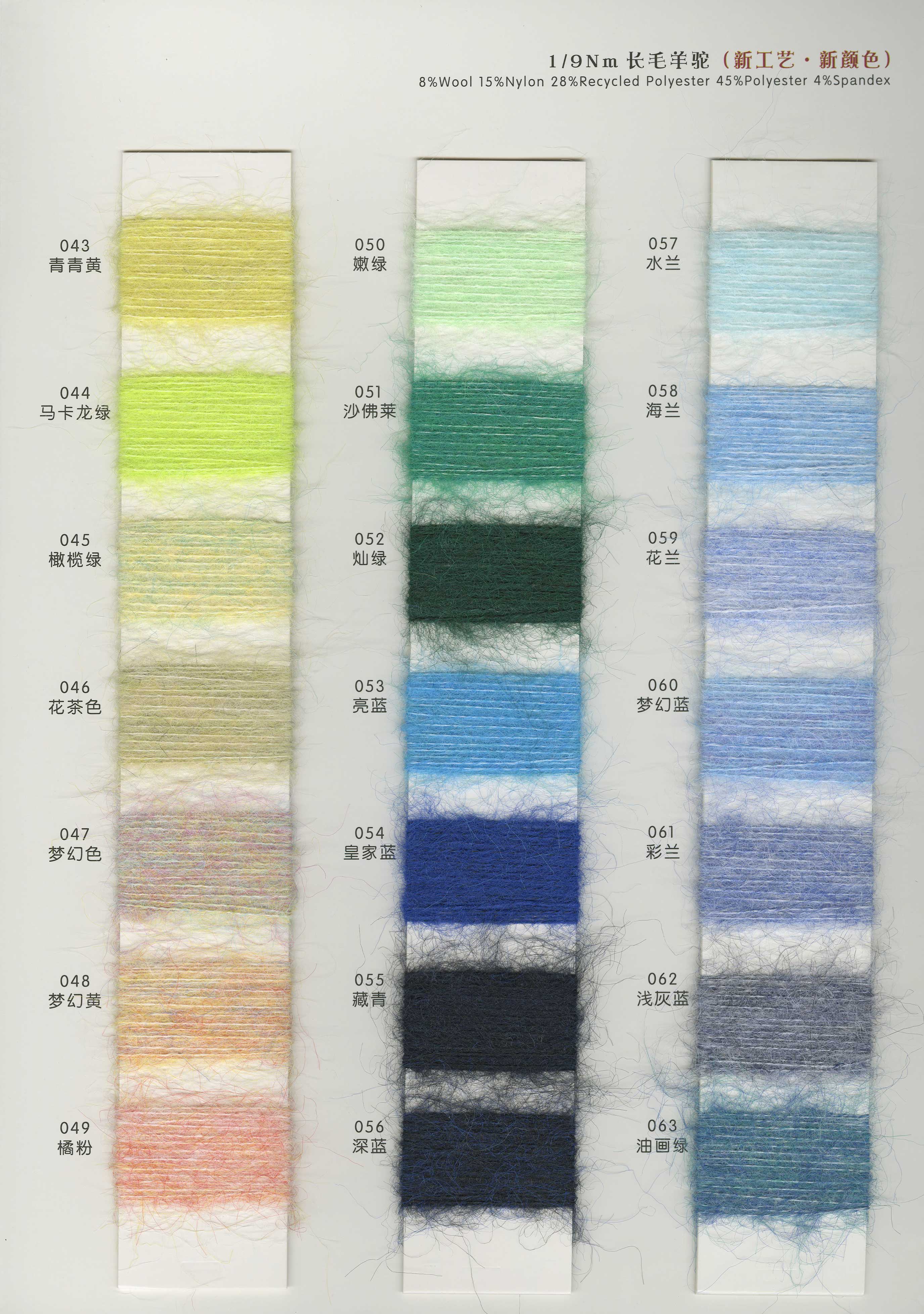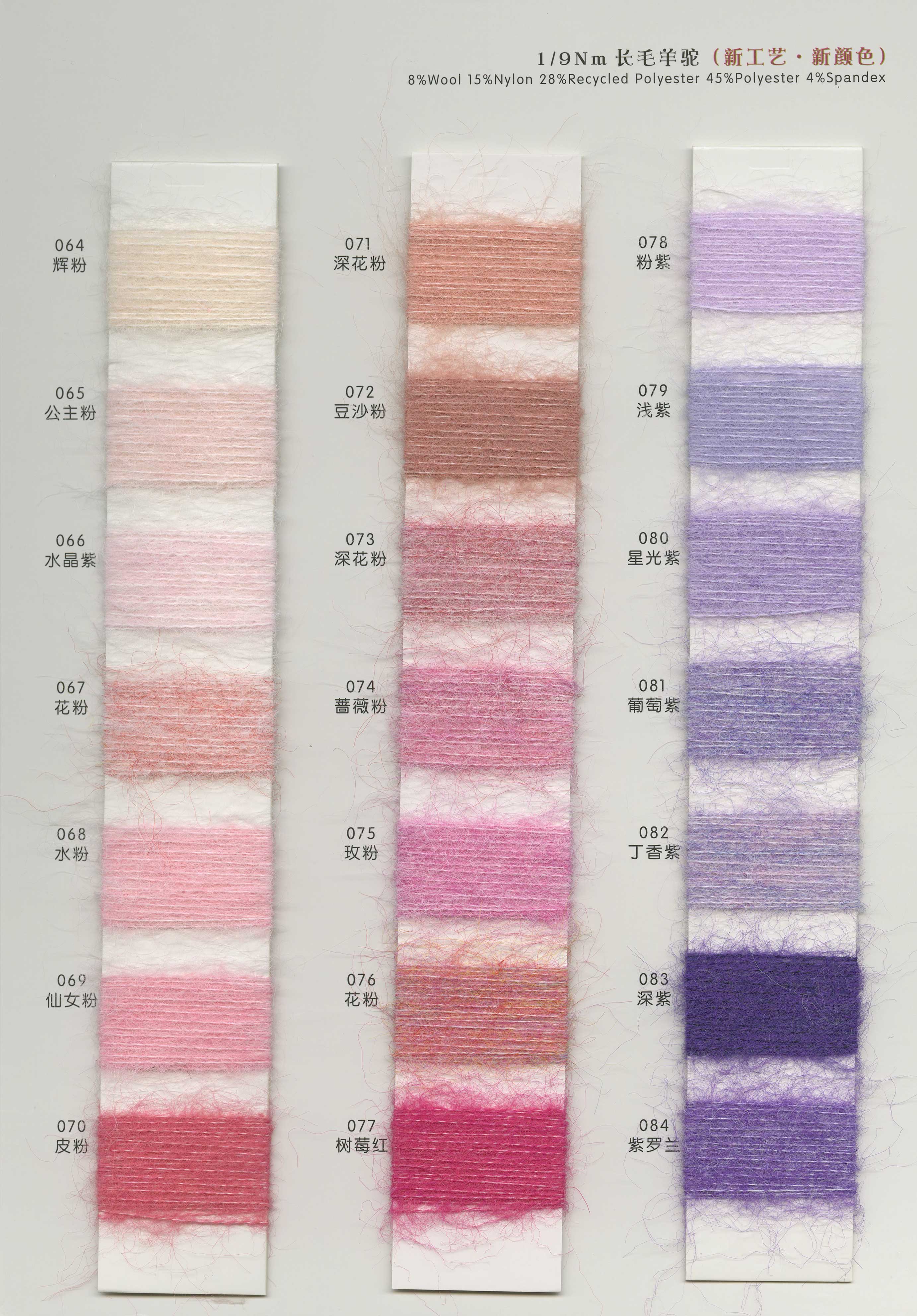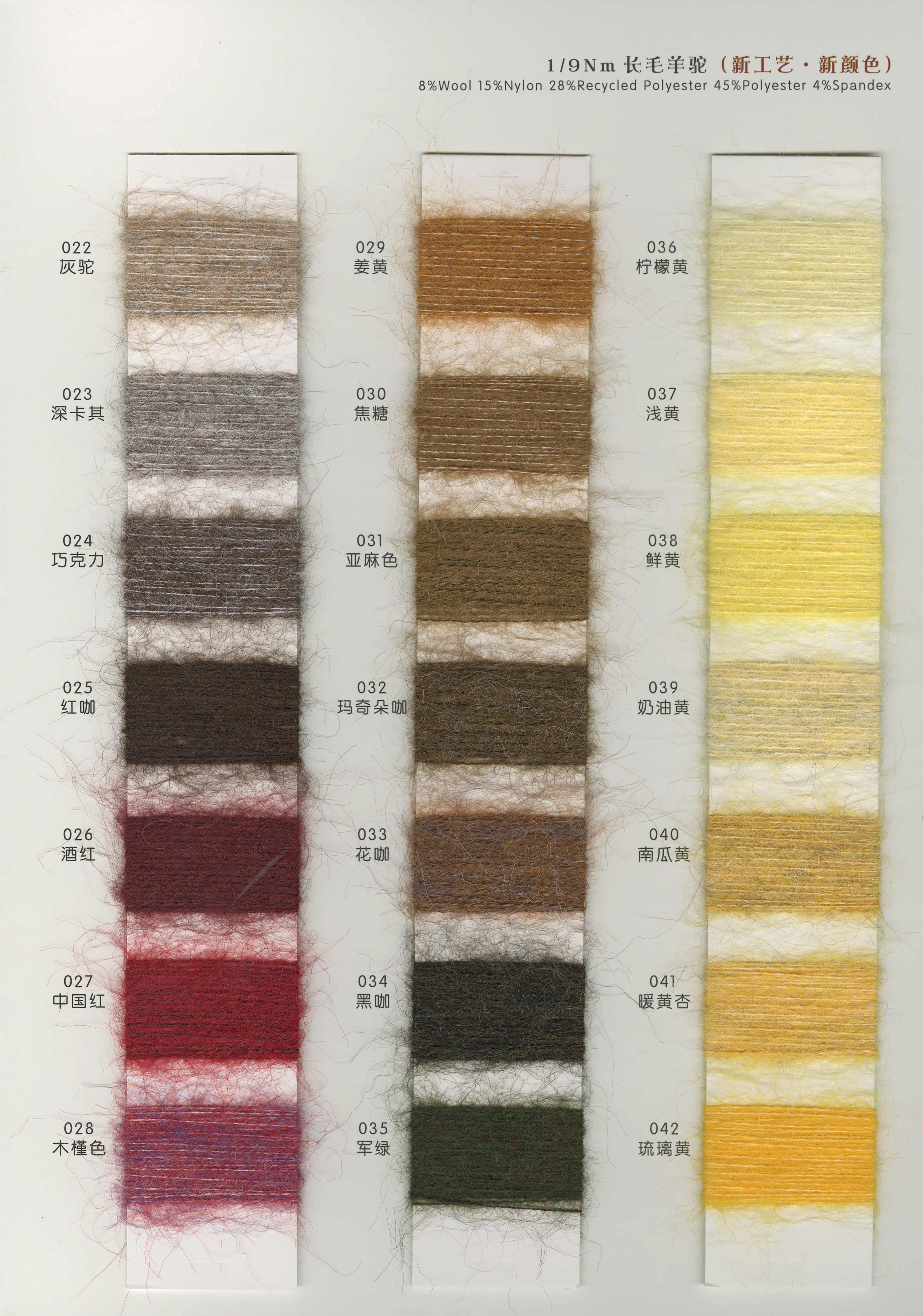 3.3支漸變噴毛紗 6支漸變馬海 15支漸變馬海 3.6支渲彩馬海 13支羊毛馬海 15支長毛馬 28支超細馬海 13支高比例馬海 13支經典羊駝 5.5支超級羊駝 13支珠片馬海 14支珠片牛絨 26支珠片北極絨 10支高端親膚絨 仿貂毛 雪尼爾及各類花式紗