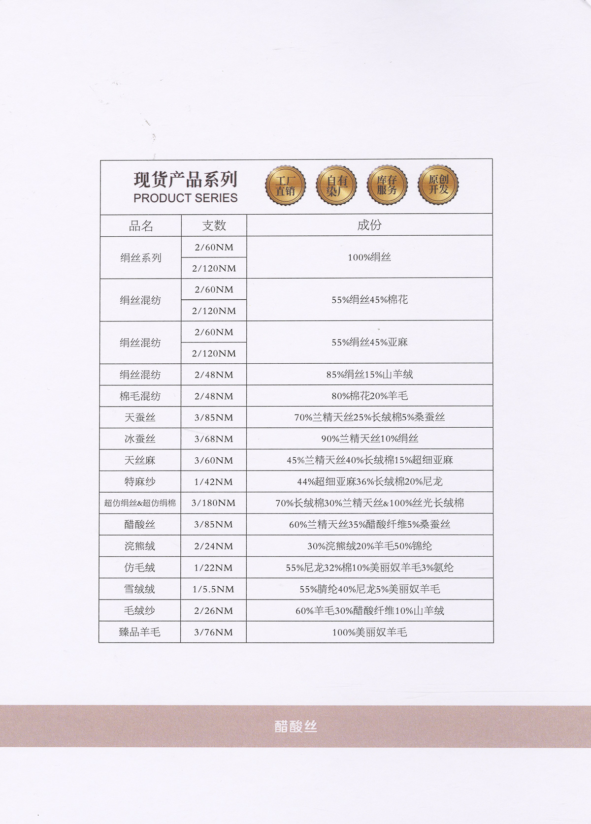 各類品牌粗精紡羊絨,德國揚子羊毛,白廠絲,桑蠶絲,絲棉等。