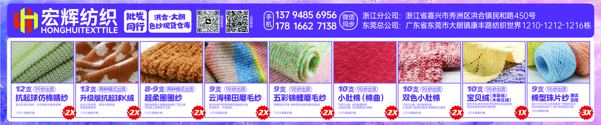 東莞市宏輝紡織有限公司電話:0769-88289289地址:大朗鎮(zhèn)康豐路紡織世界
